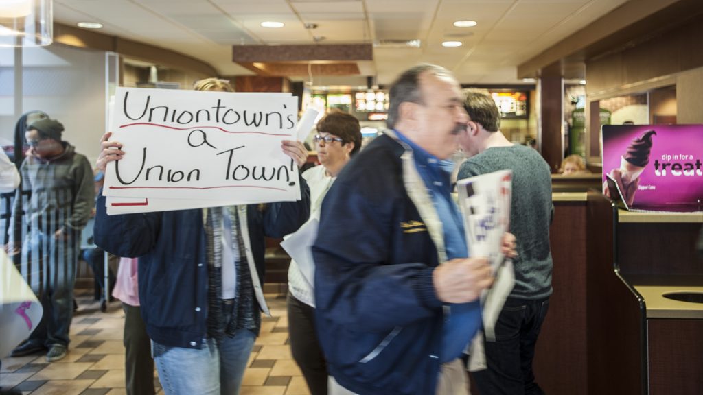 The local protesters, mostly area union members and representatives, first gathered in the Uniontown Shopping Center parking lot shortly before noon, then entered the McDonaldĢƵ holding signs calling for $15/hour wages while chanting “Forward together, not one step back.”