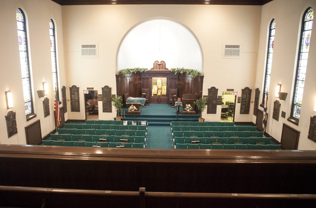 There is also original mahogany woodwork throughout the congregation and pulpit area that includes built-in storage and a set of glass doors to the case that holds the scrolls, which also feature KronickĢƵ design.