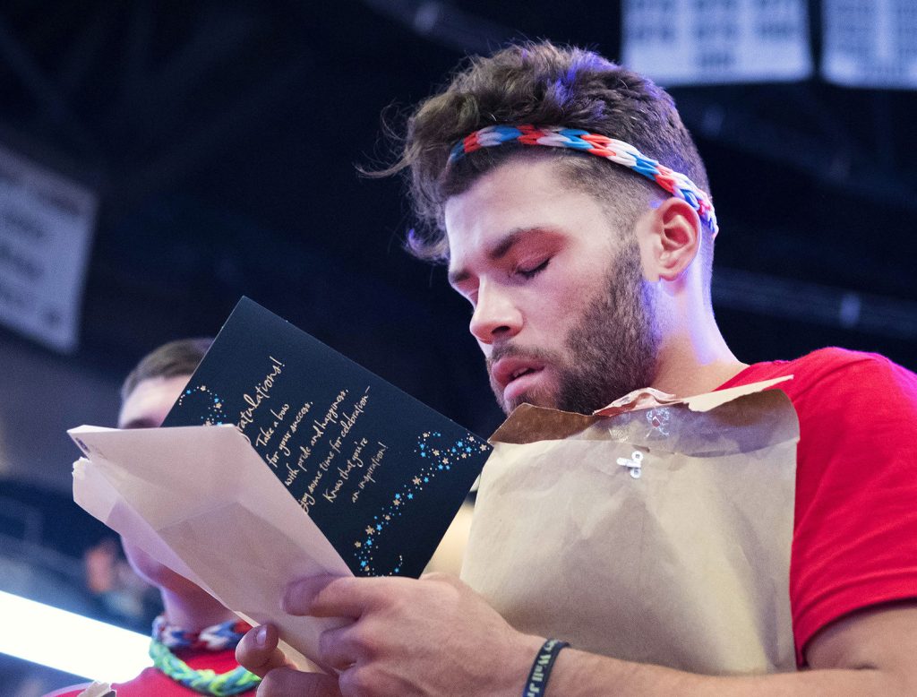 THON dancer Kyle Slavic of Penn State Fayette has an emotional moment while opening his Dancer Mail early Sunday, Feb. 19 at the Bryce Jordan Center at University Park. (Photo courtesy of Allyssa Long)