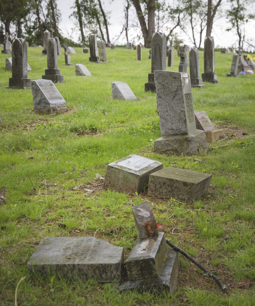 Eighteen headstones were toppled at Our Lady of Perpetual Help Catholic cemetery over the weekend, according to Greensburg Catholic Diocese spokesman Jerry Zufelt.