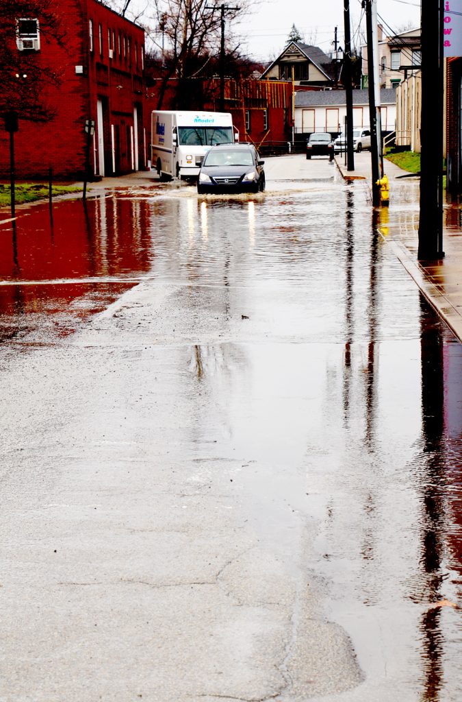 Flooding begins on Iowa Street in Uniontown on Tuesday as a few inches of rain fell overnight and throughout the day.