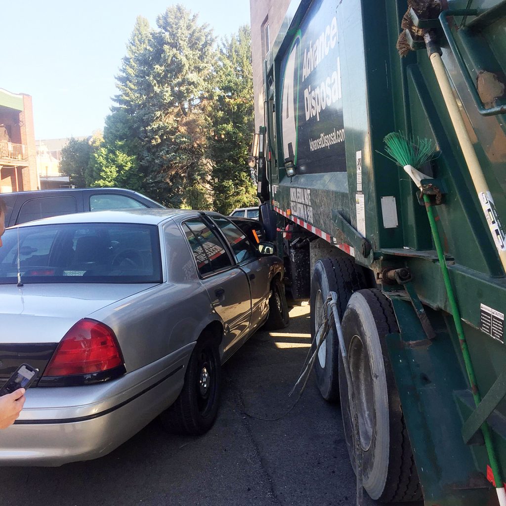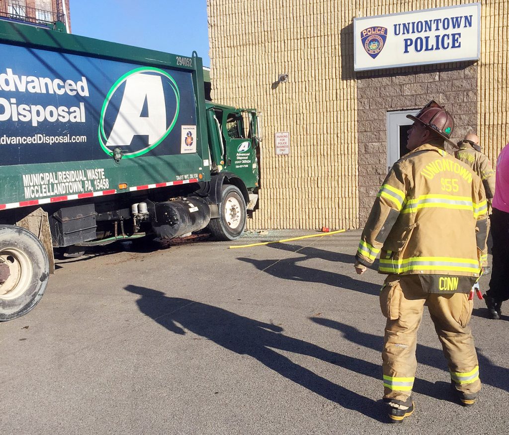 An Advanced Disposal garbage truck careened into the Uniontown City Police station Monday morning, totaling a police car, damaging a second police car and tearing down wires and barricades.