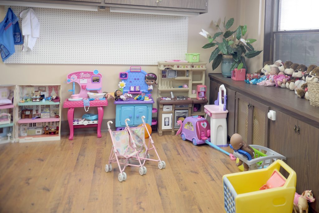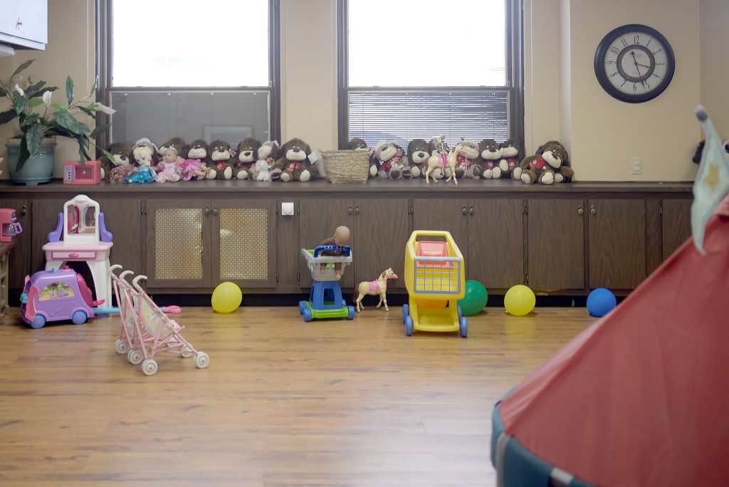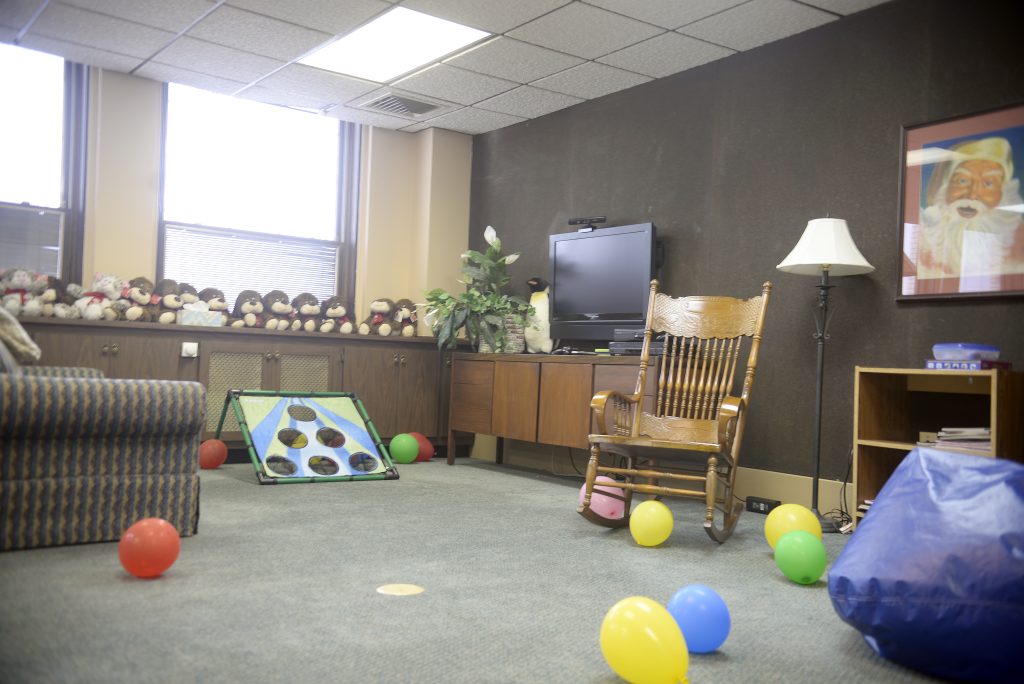 The facility was created to provide a non-threatening, home-like atmosphere for kids. The office is filled with donated toys, and teddy bears children can hold during court proceedings. The facility will also be used for supervised visits between children and parents.