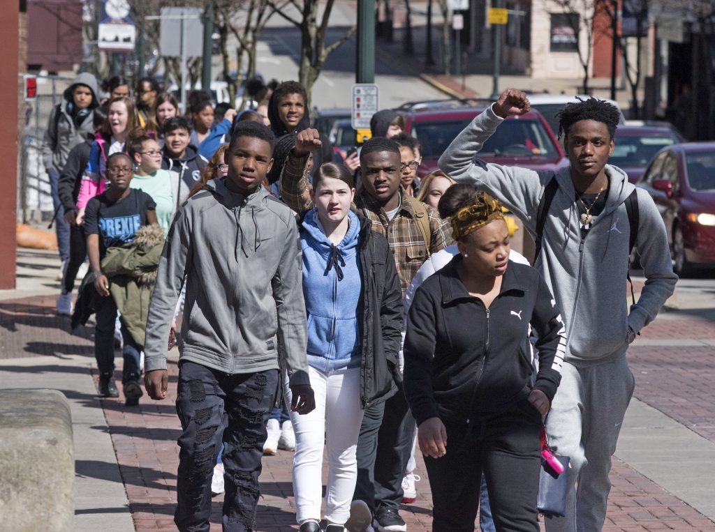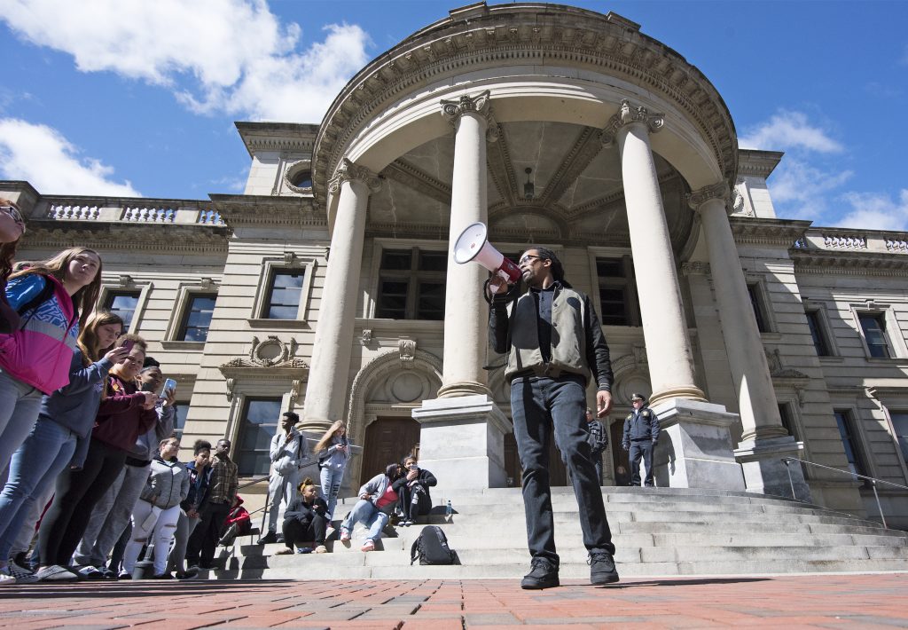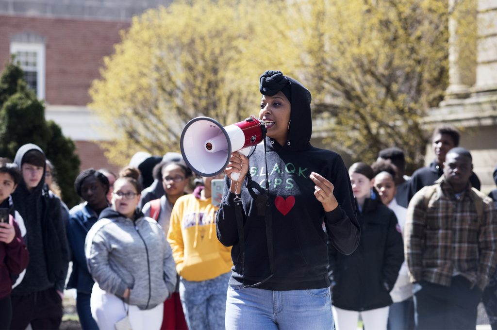 The street in front of the courthouse was closed during part of the protest. After it concluded, Willis, Dawson and other protesters marched down Main and Chestnut streets, and then down Jefferson Avenue back to Washington High School, slowing and disrupting traffic. Chet Henderson, the principal of Washington High School, stood off to the side at the rally and declined to comment on it.