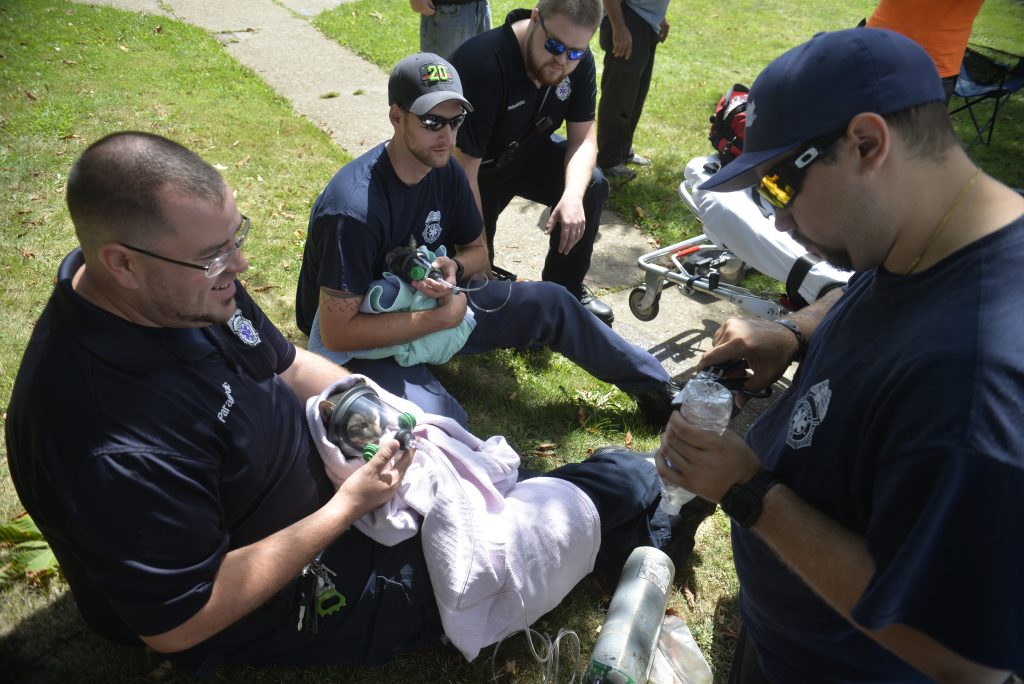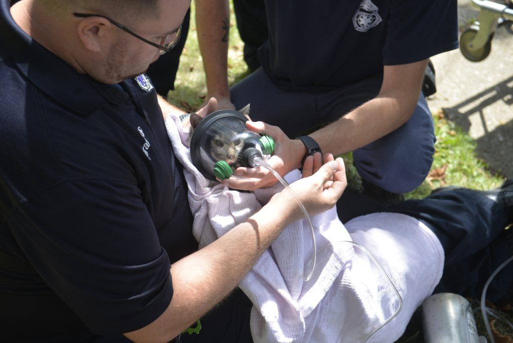 Fayette EMS paramedic Travis Caldwell wrapped the cat, Sible, in a blanket and administered oxygen, giving it water with his fingertip.