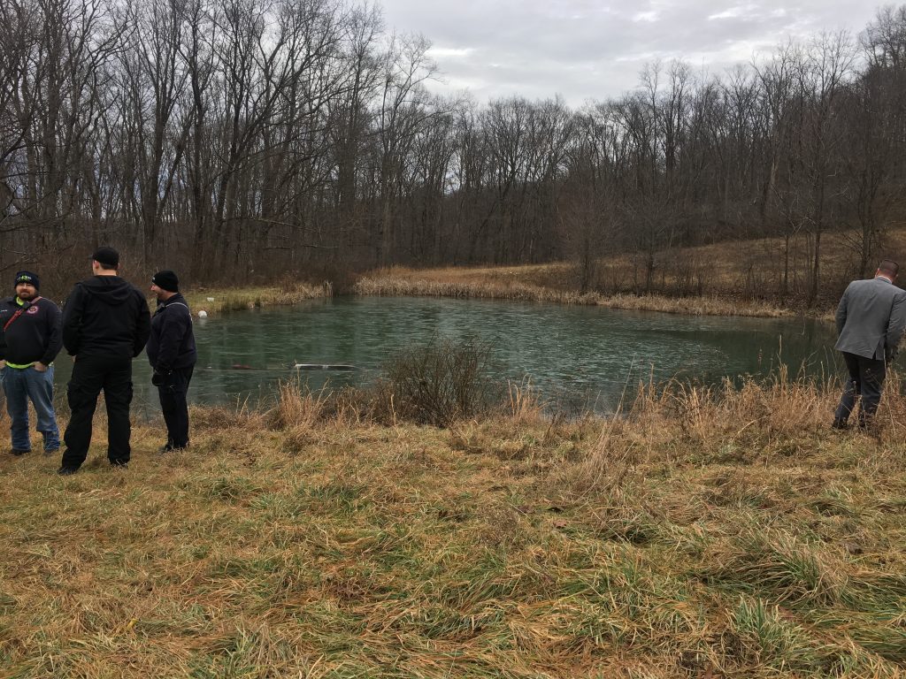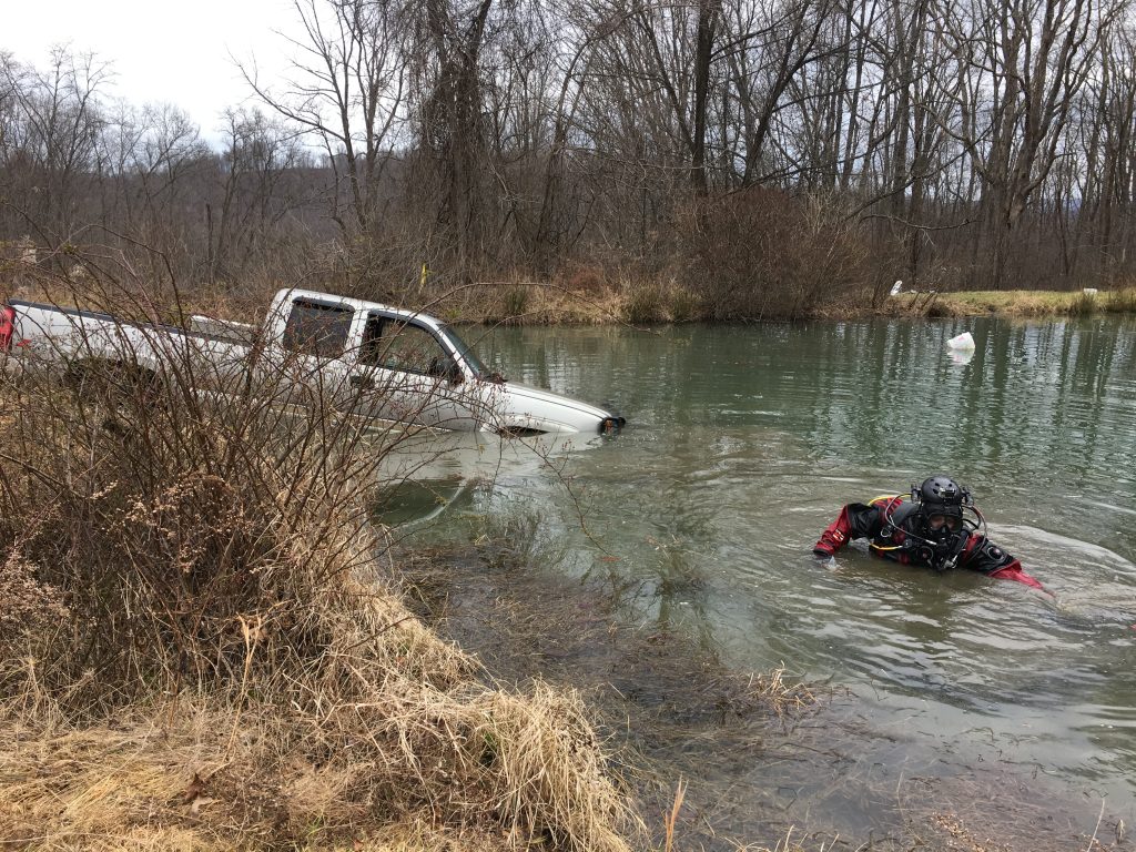 The truck was under a layer of ice when it was found around 9:30 a.m. Emergency responders could not initially tell if anyone was inside. A dive team from Murrysville was called in to assist, and determined there was no one in the vehicle. The truck was pulled out of the pond by a tow truck as the divers waited to continue searching the pond until additional resources to combat the cold temperatures arrived.