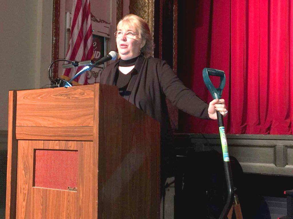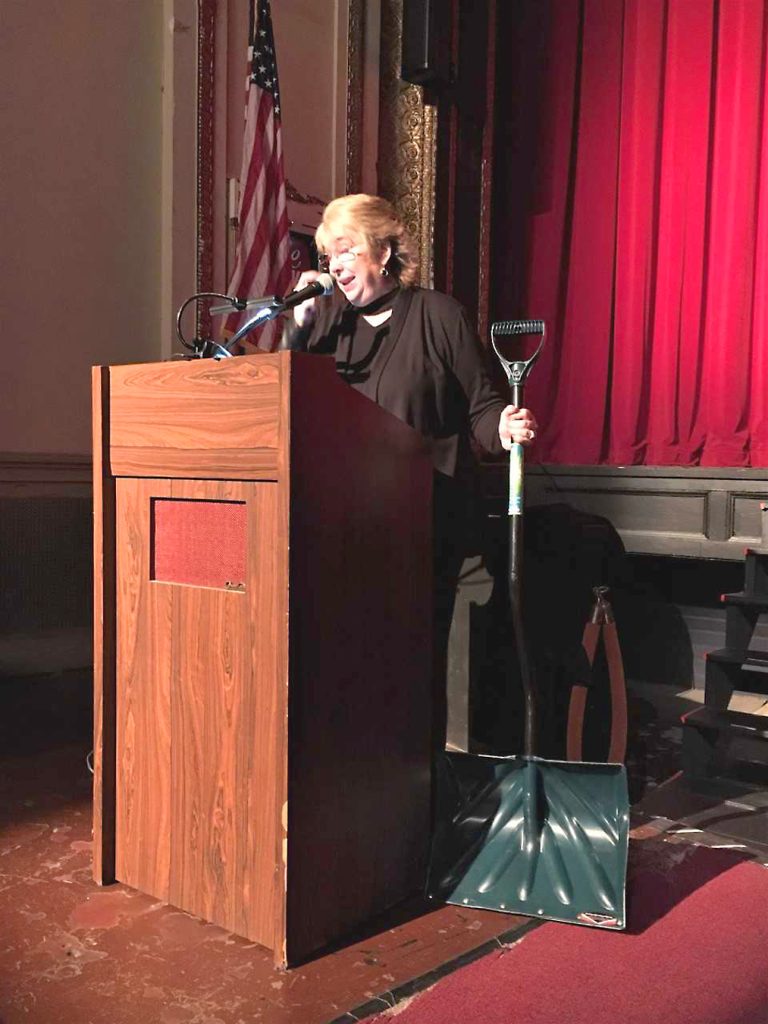 Ann Nemanic brought a snow shovel to the State Theatre Center for the Arts in Uniontown where $469,122 in grants were recently presented to 26 Fayette County tourism-related businesses and organizations.