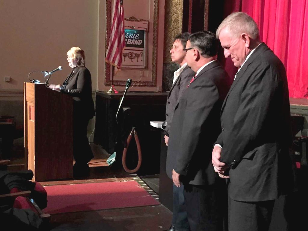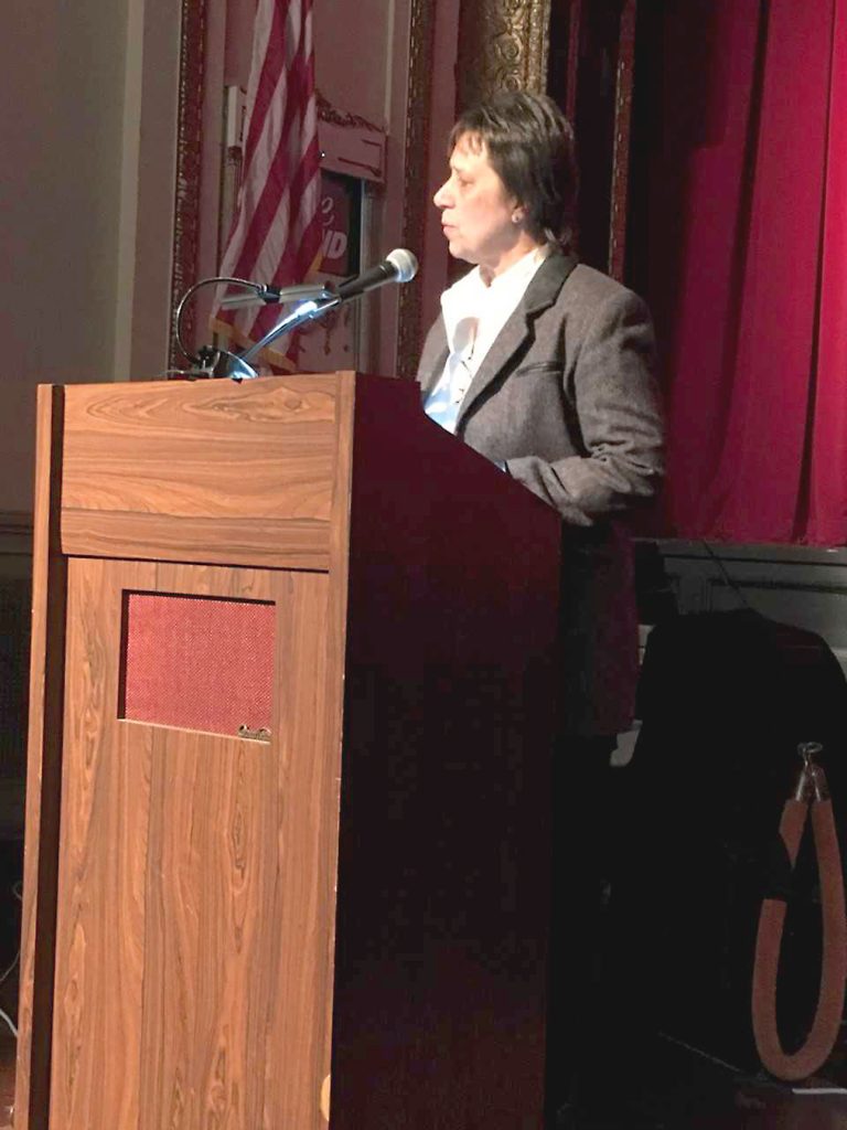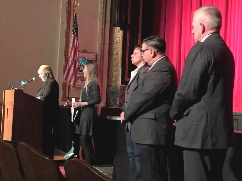 Ann Nemanic, left at podium, executive director of Laurel Highlands Visitors Bureau, announces the names of 26 Fayette County tourism-related businesses and organizations that received a combined $469,122 in grants at a recent distribution ceremony the State Theatre Center for the Arts in Uniontown. The grant program is funded through the Fayette County Hotel Room Tax. Ready to greet the recipients are (from left) Fayette County Commissioners Angela Zimmerlink, Vincent Vicites and Dave Lohr.