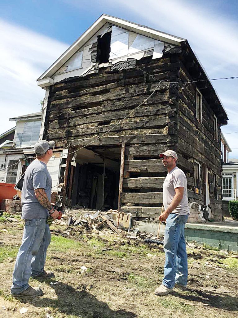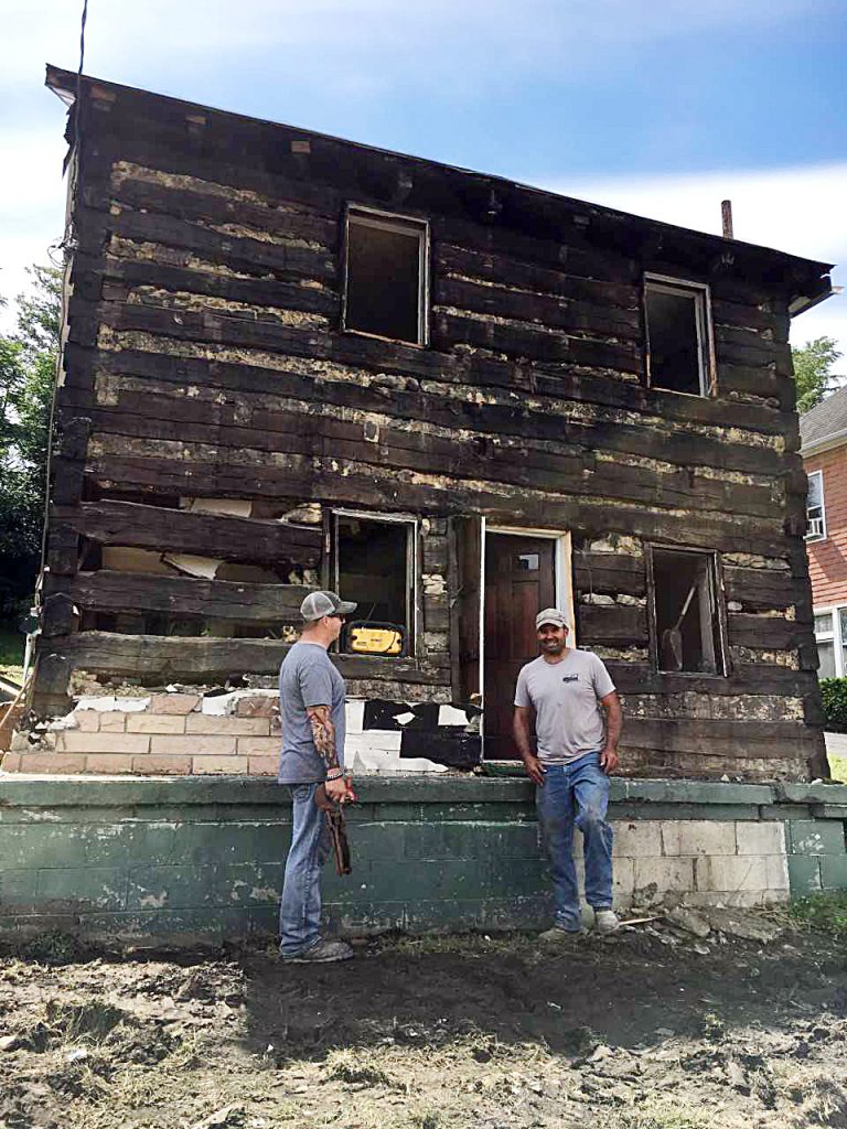 Joe Bogumit, left, of Fredericktown, and Jerrod Stickovich, of Carmichaels, stand in front of an 1820s log house recently discovered in Brownsville. Stickovich owns Fitly Joined and Built-in, an historic restoration company,with his mother, Donna Stickovich, of Deemston. The company is dismantling the house and plans to sell it.