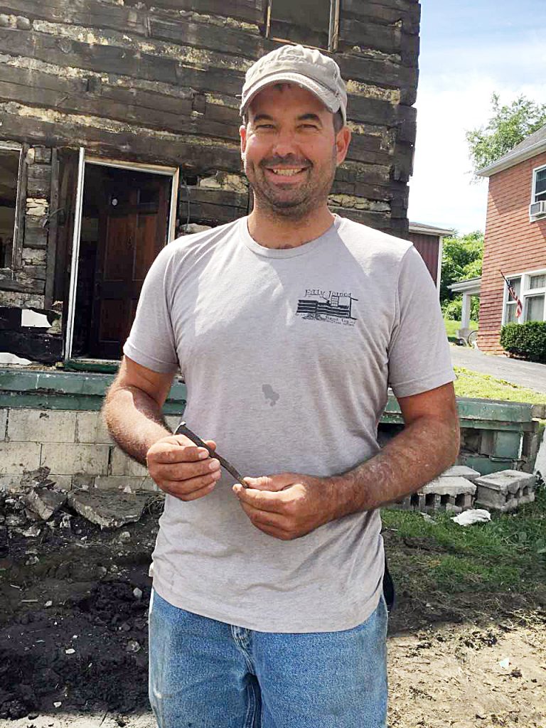 Jerrod Stickovich, of Carmichaels, shows off a six-inch nail found in this 1820s log house recently discovered in Brownsville. Stickovich owns Fitly Joined and Built-in, an historic restoration company,with his mother, Donna Stickovich, of Deemston. The company is dismantling the house and plans to sell it.
