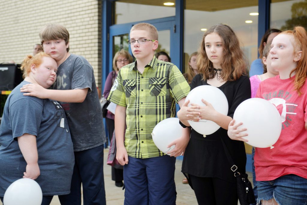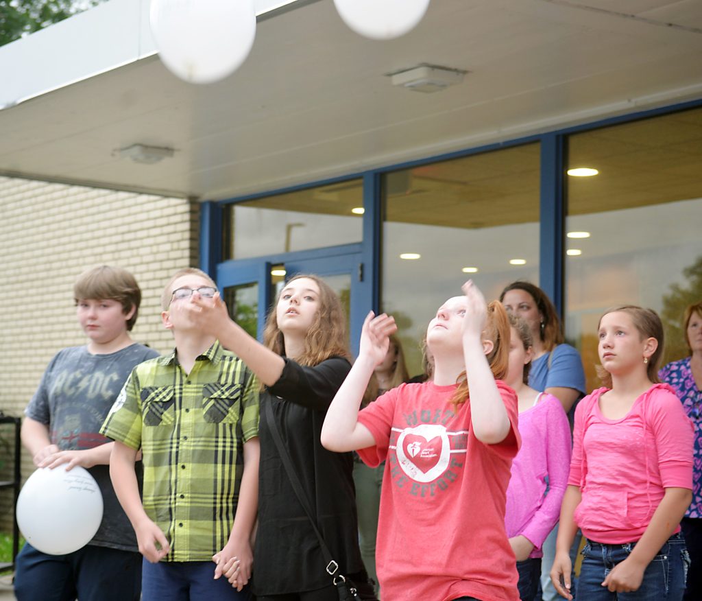 Connellsville Area Middle School students prepare to release balloons with messages to their friend, 11-year-old Hayden M. Field, who died in a car accident April 25. Some of his closest friends organized “A Night for Hayden” Thursday to remember the 6h grade student.