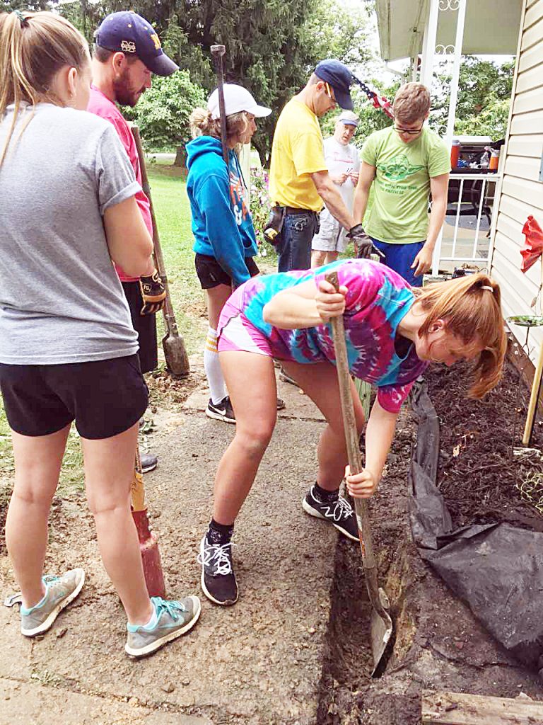 Volunteers for Reach Mission Trips dig posts for a ramp at a McClellandtown home, including (from left) Emma Farley and Bryan Logan, of Virginia, Elizza Easley, of Illinois, and Ohio residents Shawn Foster, John Cole, Kenny Lambert and Gabby Freshley, working the shovel.