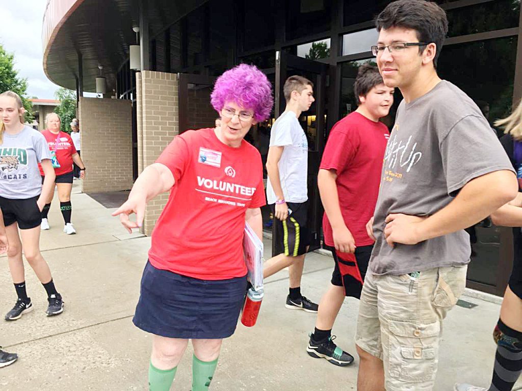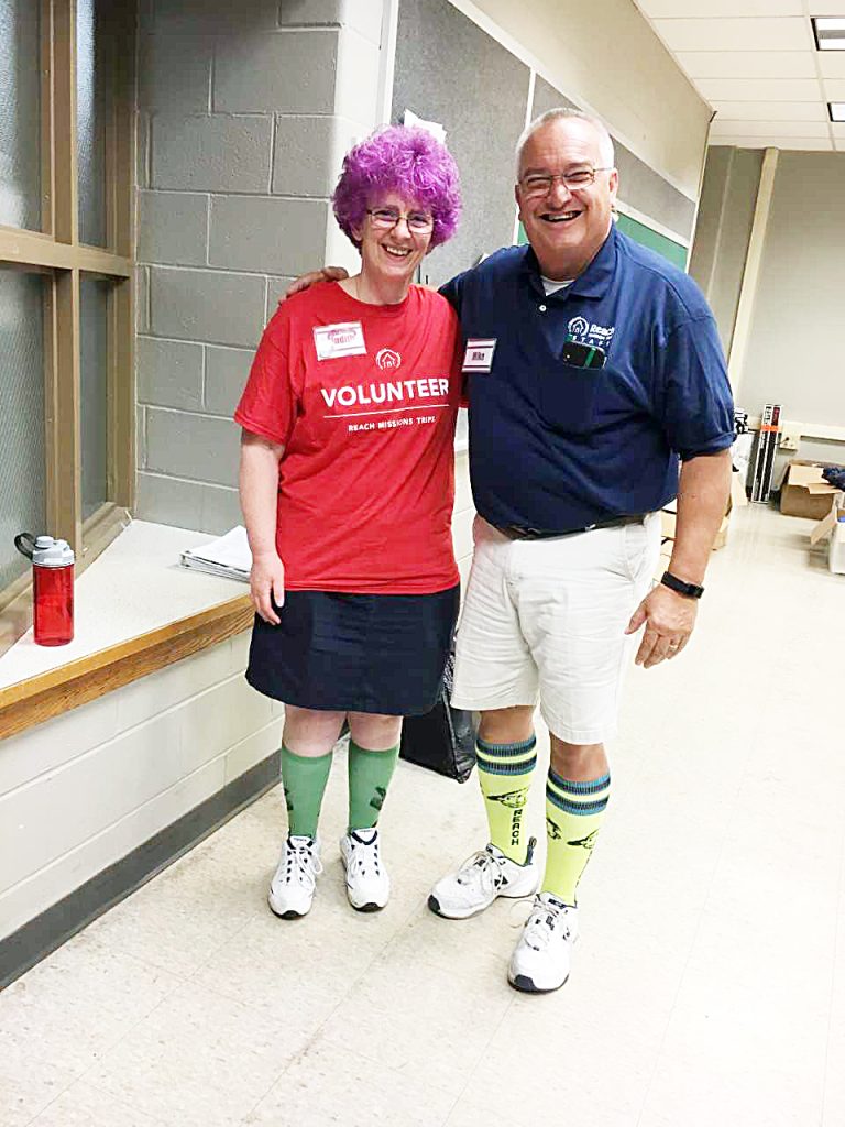 Dr. Judith Taylor, left, local coordinator from St. PeterĢƵ Anglican Church in Uniontown, and Mike Jones, founder of Reach Mission Trips, share a smile at Albert Gallatin High School where volunteers are making their base. Taylor allowed the first youth to register for the work camp to select her hair color.