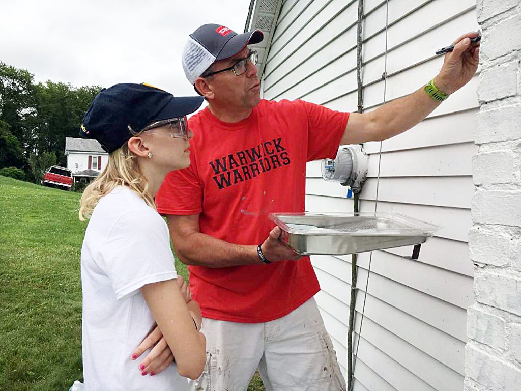 Jim Nagle, of St. PeterĢƵ Anglican Church in Uniontown, right, shows his daughter, Maura, how to paint a house in German Township as volunteers for Reach Mission Trips. This is JimĢƵ third work camp and MauraĢƵ first. Altogether 500 volunteers from four states are helping qualified Fayette County homeowners in June.