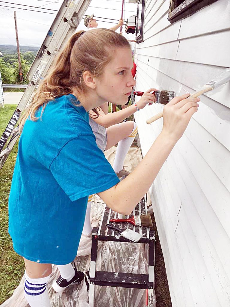 Sirena Benton, of Illinois, paints a German Township house as a volunteer for Reach Mission Trips, which is performing free basic home repairs for qualified home owners in southern Fayette County in June.