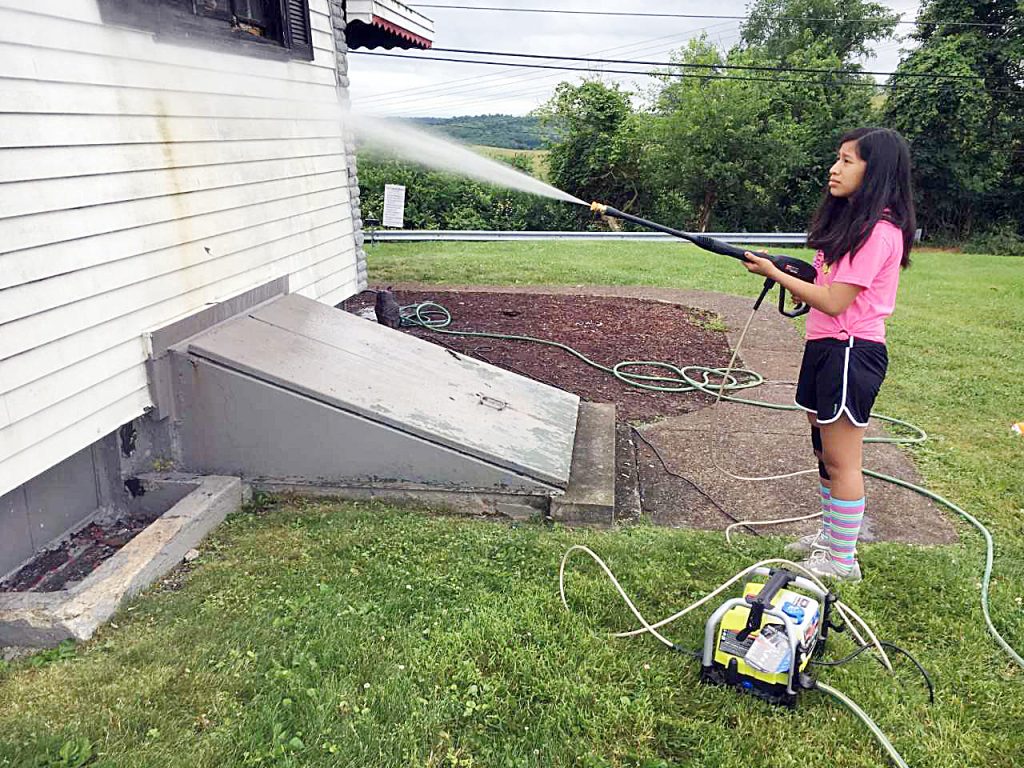 Abby Sinal, of St. PeterĢƵ Anglican Church in Uniontown, power washes a German Township house before itĢƵ painted. Volunteers from Reach Mission Trips, a non-denominational, nonprofit, are performing free basic home repairs for qualified Fayette County homeowners in June.