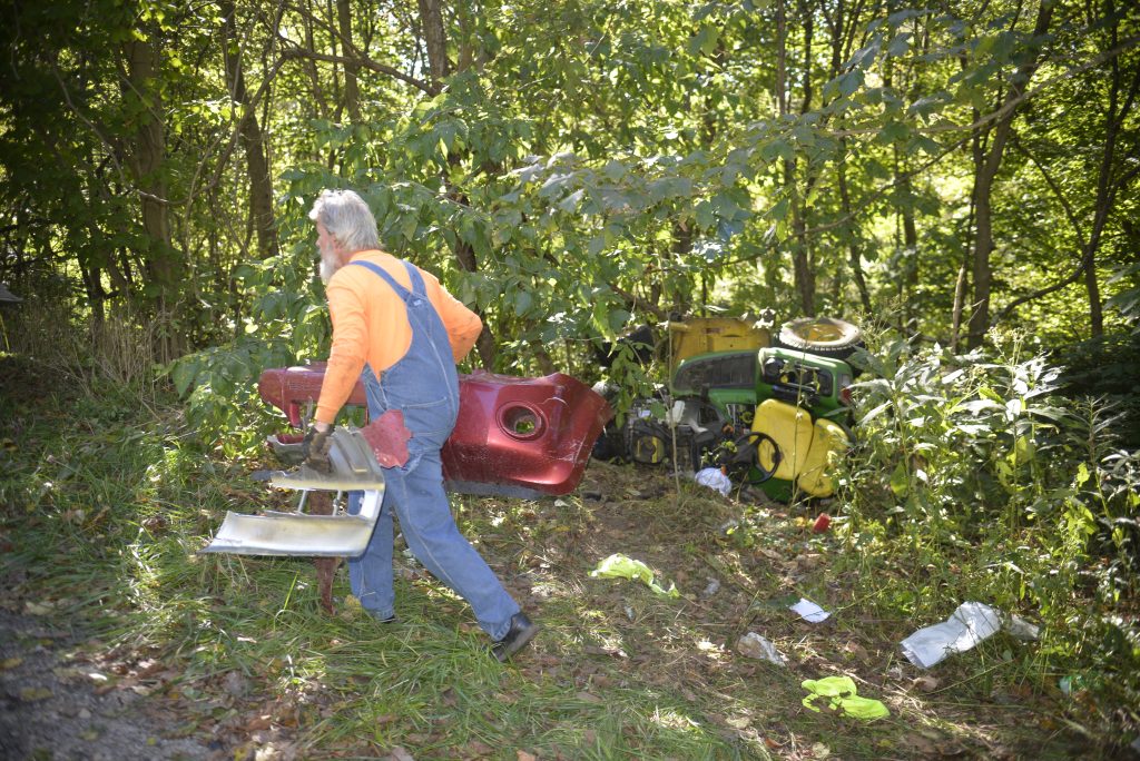 A tow truck driver collects pieces of an SUV that hit a small, green riding lawnmower, injuring the man who was riding it on Smithfield Masontown Road Wednesday morning.