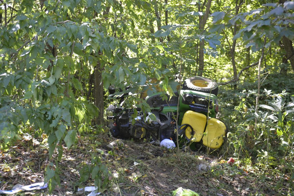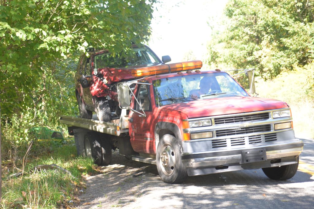 An SUV hit a man driving small, green riding lawnmower on Smithfield Masontown Road Wednesday morning. The tractor can be seen in the woods behind the tow truck. The man on the lawnmower was injured and flown from the scene by medical helicopter.
