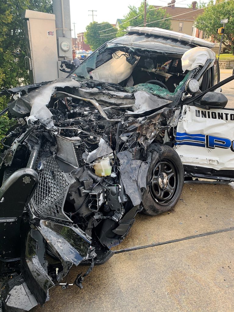 Officer Jay Hanley was unconscious after the collision near the intersection of Fayette Street and Pennsylvania Avenue at about 5:45 p.m., and the police vehicle caught fire. Captain David Rutter and a bystander, Daylan McLee, rescued Hanley from the vehicle, according to Uniontown City Police Lt. Tom Kolencik.