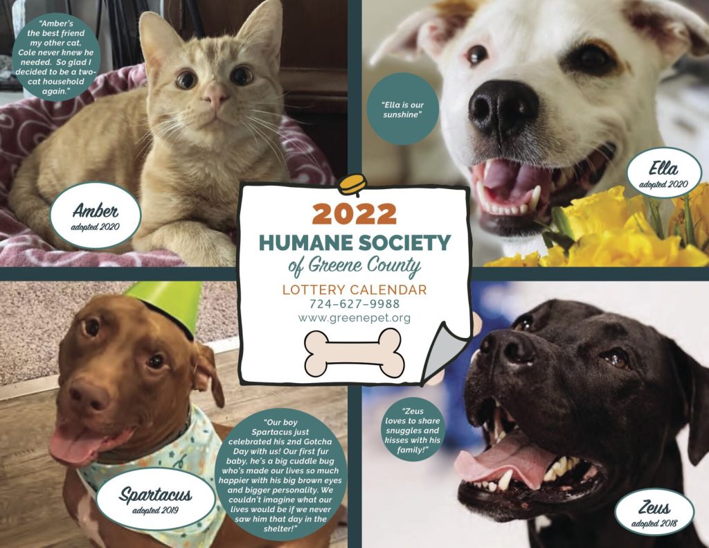 The bright, cheerful calendars filled with photos of happily-adopted pets can be purchased for $30 online at https://greenepet.org/product/2022-humane-society-of-green-county-lottery-calendar/.