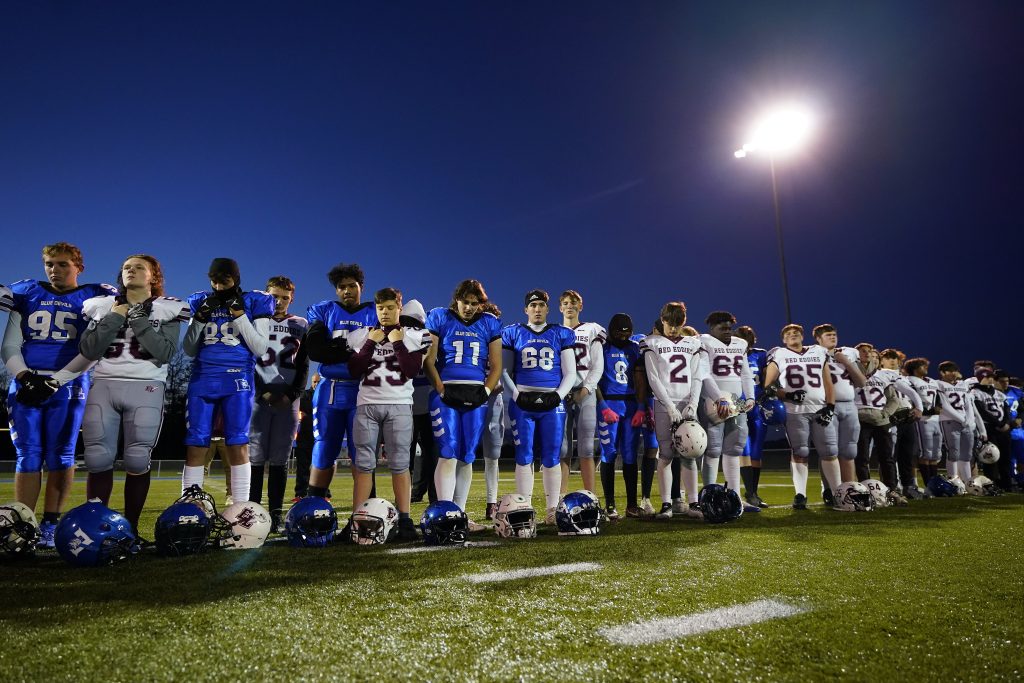 Lewiston High School and Edward Little High School players stand together, Wednesday, Nov. 1, 2023, prior to their high school football game in Lewiston, Maine. Locals seek a return to normalcy after a mass shooting on Oct. 25.