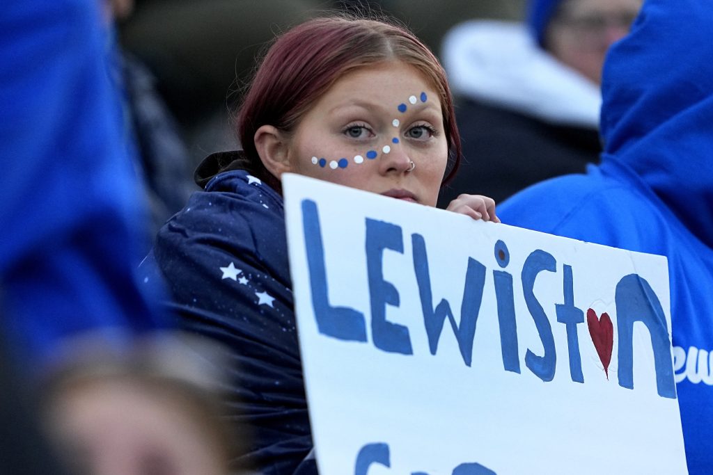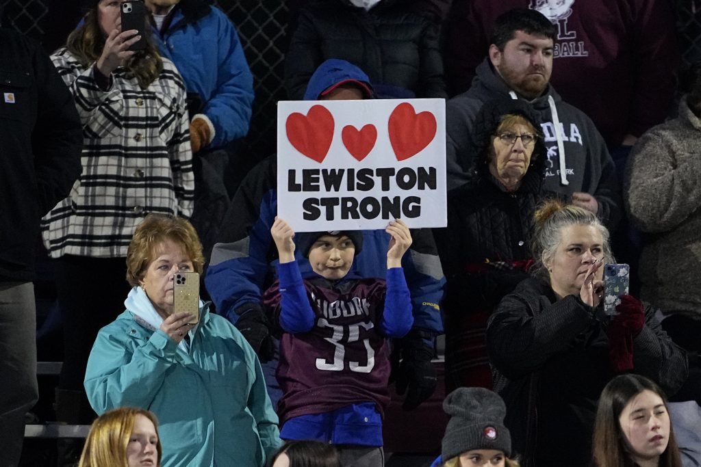 A Lewiston High School fan holds a sign, Wednesday, Nov. 1, 2023, prior to a high school football game against Edward Little High School, in Lewiston, Maine. Locals seek a return to normalcy after a mass shooting on Oct. 25.