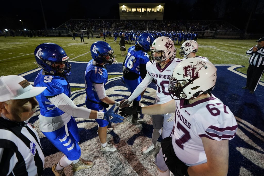 Lewiston High School players greet Edward Little High School, Wednesday, Nov. 1, 2023, prior to a high school football game in Lewiston, Maine. Locals seek a return to normalcy after a mass shooting on Oct. 25.