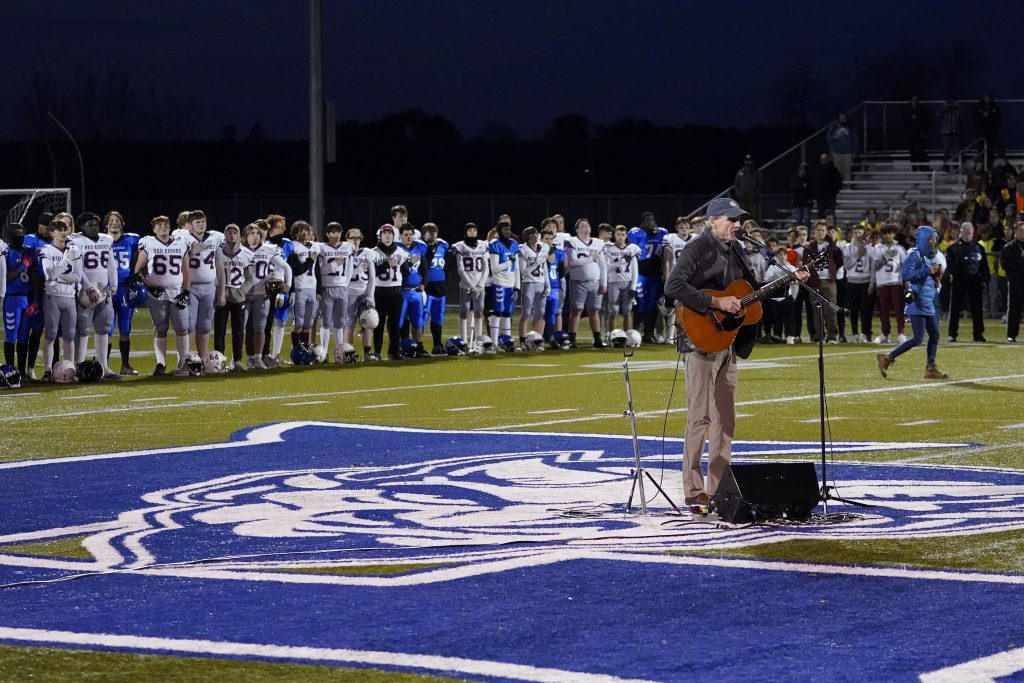 Singer James Taylor sings the national anthem as Lewiston High School and Edward Little High School players stand together, Wednesday, Nov. 1, 2023, prior to a high school football game in Lewiston, Maine. Locals seek a return to normalcy after a mass shooting on Oct. 25.