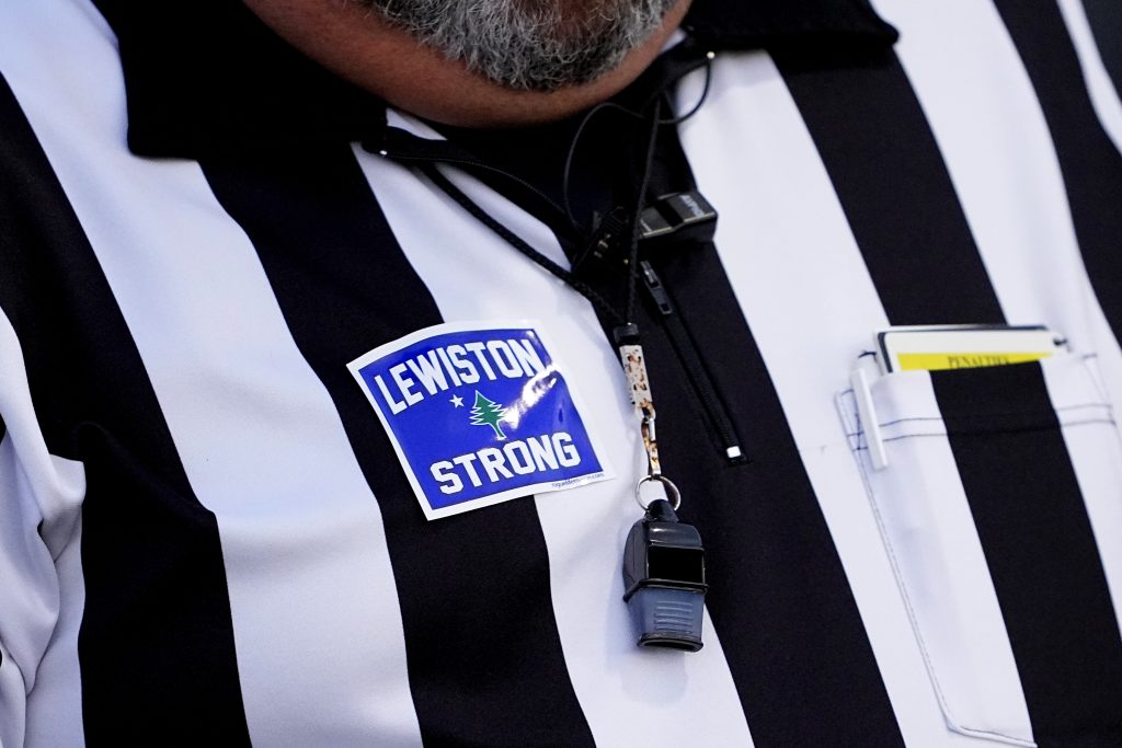 A referee wears a Lewiston Strong sticker on his jersey prior to a Lewiston High School and Edward Little High School football game, Wednesday, Nov. 1, 2023, in Lewiston, Maine. Locals seek a return to normalcy after a mass shooting on Oct. 25.