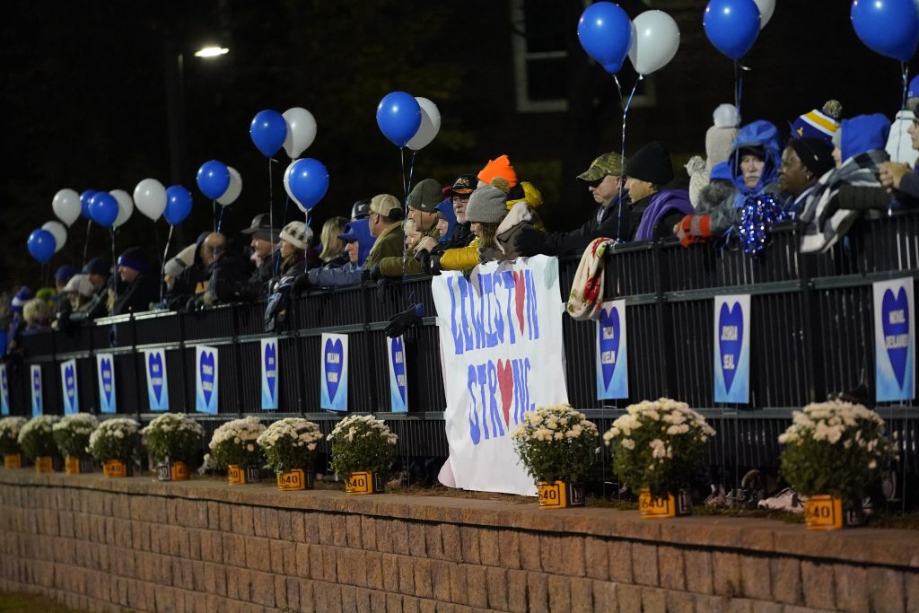 Fans and students decked out in school colors began arriving about two hours before kickoff to snag good seats. Blue and white balloons hung from a fence near the field, and a banner displayed the interlocked first letters of Lewiston and Auburn and the phrase, “We stand together.”