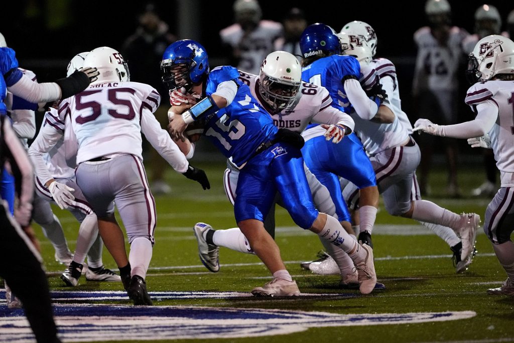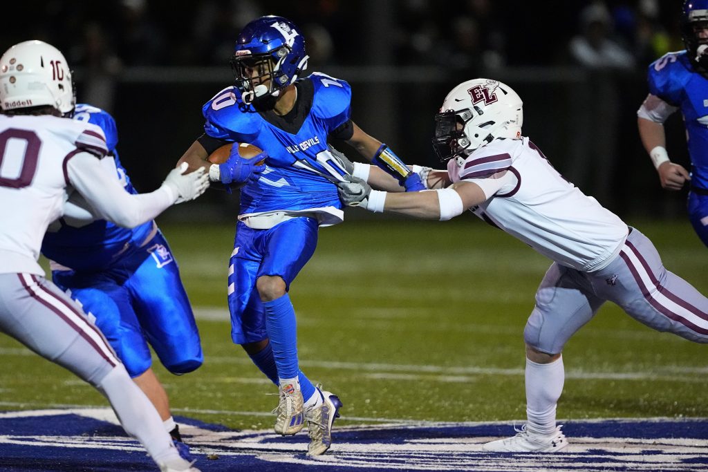 Lewiston High School and Edward Little High School football players compete during a high school football game, Wednesday, Nov. 1, 2023, in Lewiston, Maine. Locals seek a return to normalcy after a mass shooting on Oct. 25.