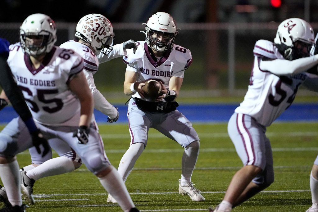Edward Little High School quarterback Kade Masselli (6) takes the snap, Wednesday, Nov. 1, 2023, during a high school football game against Lewiston High School in Lewiston, Maine. Locals seek a return to normalcy after a mass shooting on Oct. 25.