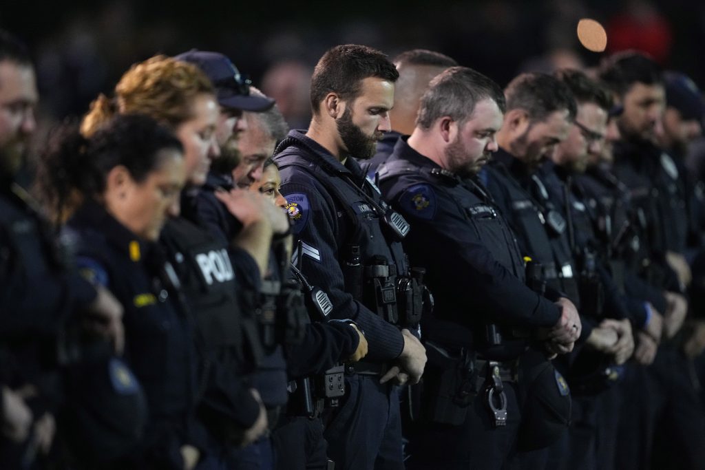 Lewiston Police officers stand during a moment of silence for the victims of the Lewiston shooting, Wednesday, Nov. 1, 2023, prior to a high school football game between Lewiston High School and Edward Little High School in Lewiston, Maine. Locals seek a return to normalcy after the mass shooting on Oct. 25.