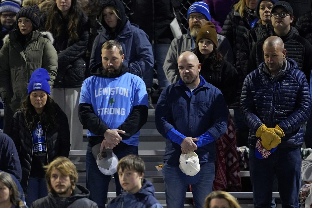 Lewiston High School fans stand during a moment of silence for the victims of the Lewiston shooting, Wednesday, Nov. 1, 2023, prior to a high school football game against Edward Little High School in Lewiston, Maine. Locals seek a return to normalcy after the mass shooting on Oct. 25.