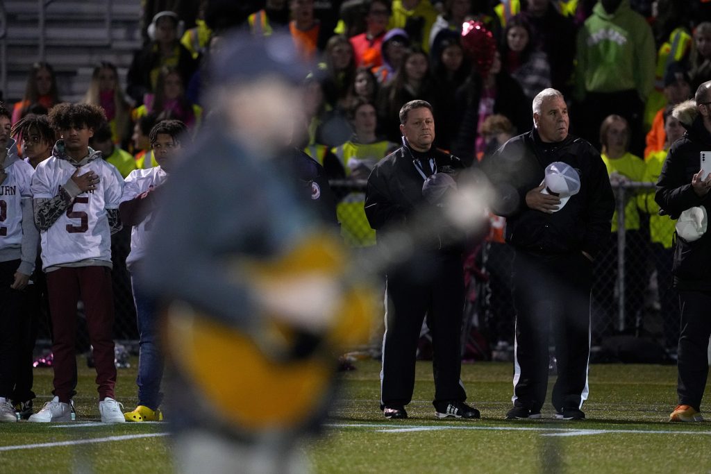 First responders stand during a moment of silence for the victims of the Lewiston shooting, Wednesday, Nov. 1, 2023, prior to a high school football game between Lewiston High School and Edward Little High School in Lewiston, Maine. Locals seek a return to normalcy after the mass shooting on Oct. 25.