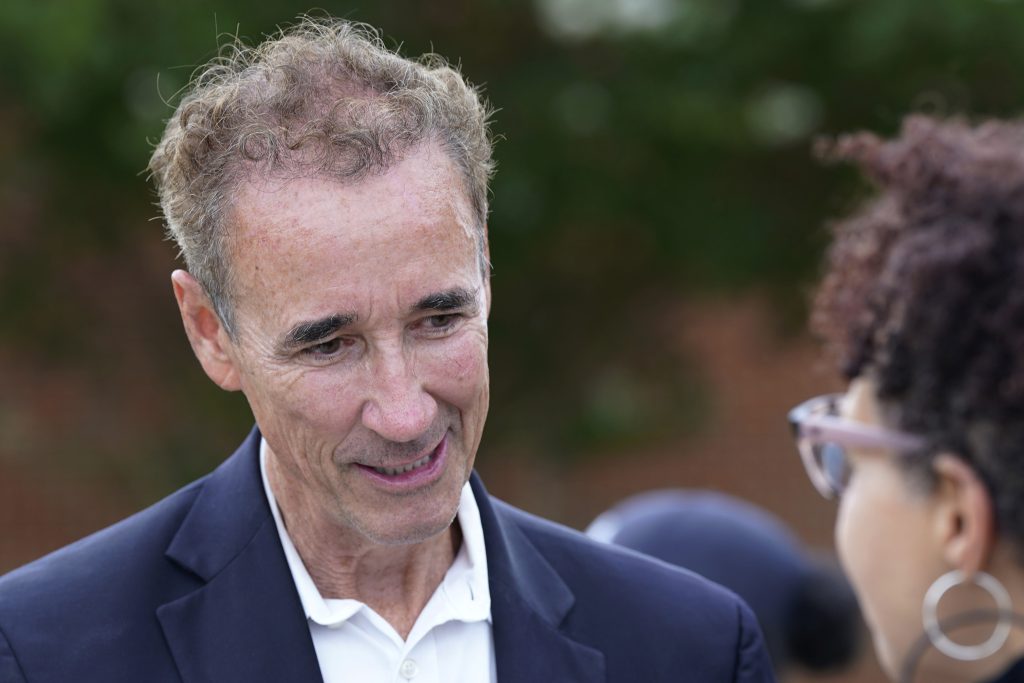 FILE - Virginia State Sen. Joe Morrissey, left, greets a voter as he visits a polling precinct Tuesday, June 20, 2023, in Henrico, Va.