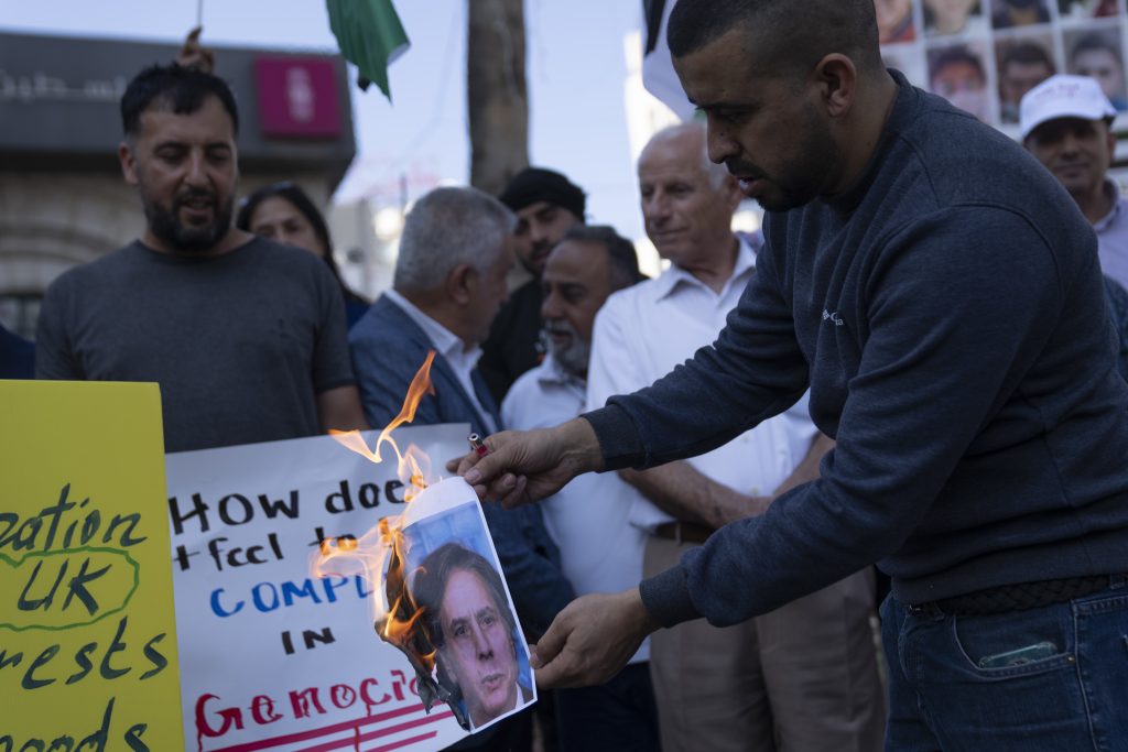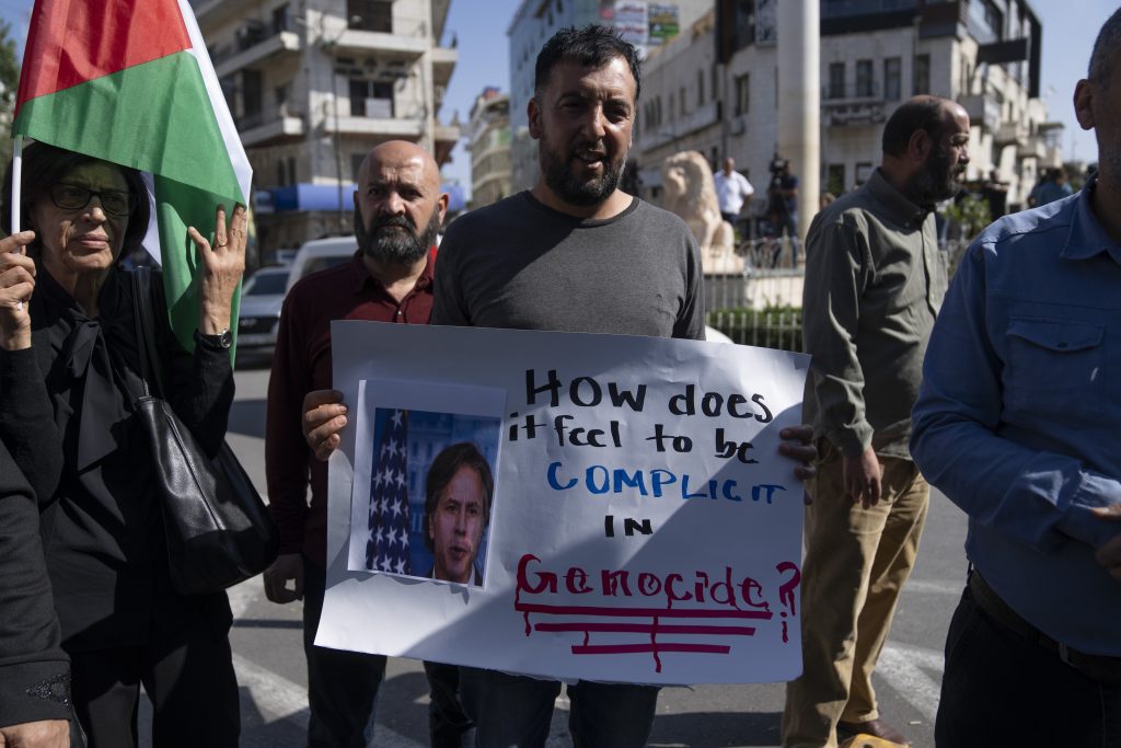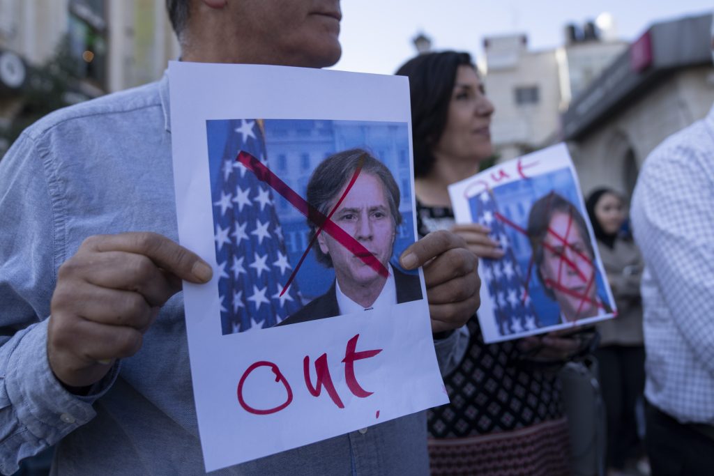 As word spread of BlinkenĢƵ arrival in Ramallah, Palestinians turned out to protest U.S. support for IsraelĢƵ war. Demonstrators held signs showing dripping blood and with messages that included, “Blinken blood is on your hands.”