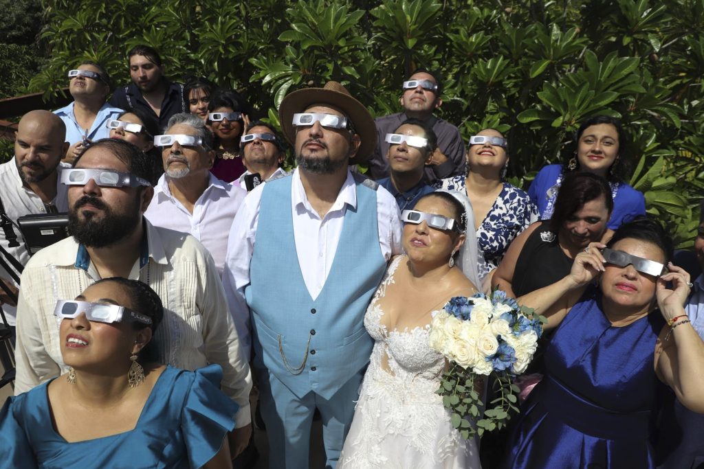 Isaac Medina, center, and Jazmin Gonzalez, center right, watch a "ring of fire" solar eclipse before their wedding ceremony in Merida, Mexico, Saturday, Oct. 14, 2023. The annular eclipse dimmed the skies over parts of the western U.S. and Central and South America.