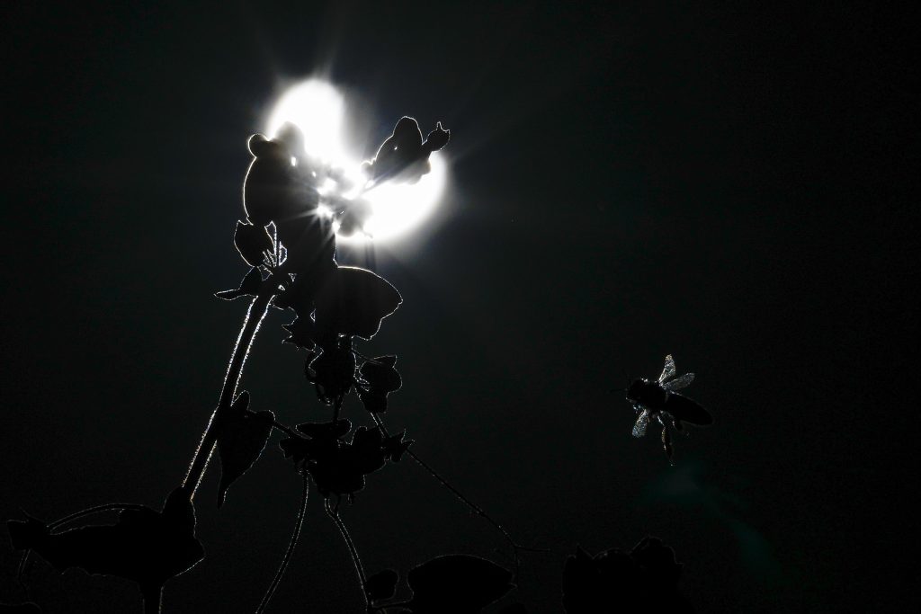 A bee flies near a flower during a solar eclipse on Saturday, Oct. 14, 2023, in Austin, Texas.