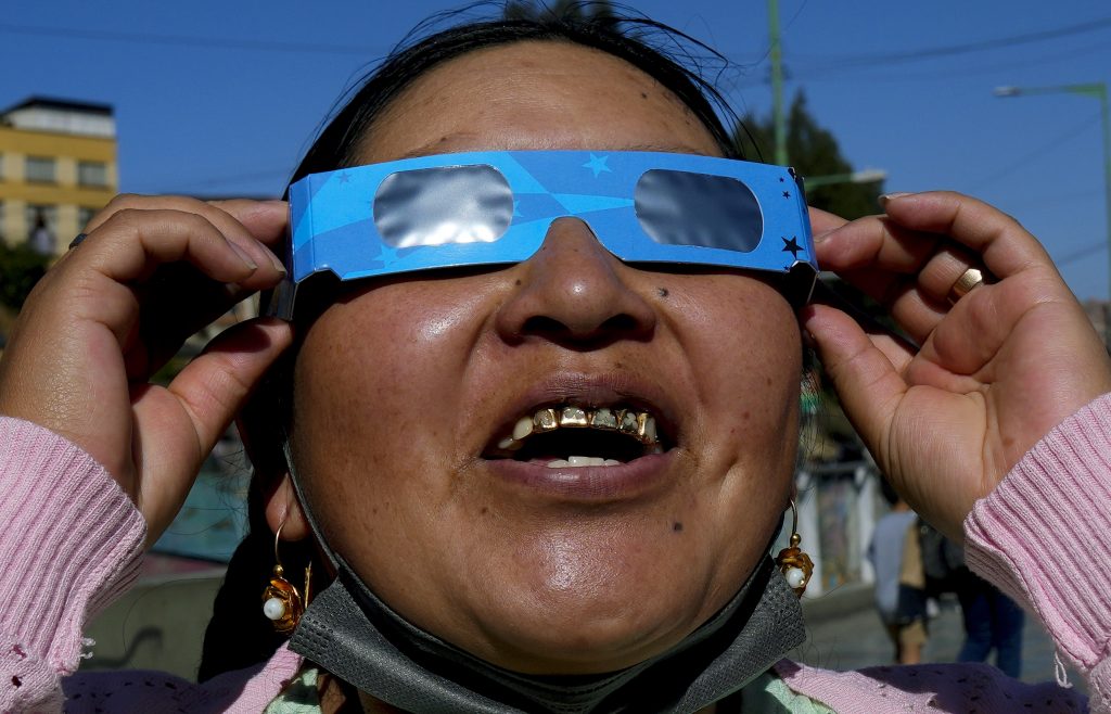 A woman watches the "ring of fire" solar eclipse in La Paz, Bolivia, Saturday, Oct. 14, 2023. The solar eclipse briefly dimmed the skies over parts of the western U.S. and Central and South America.