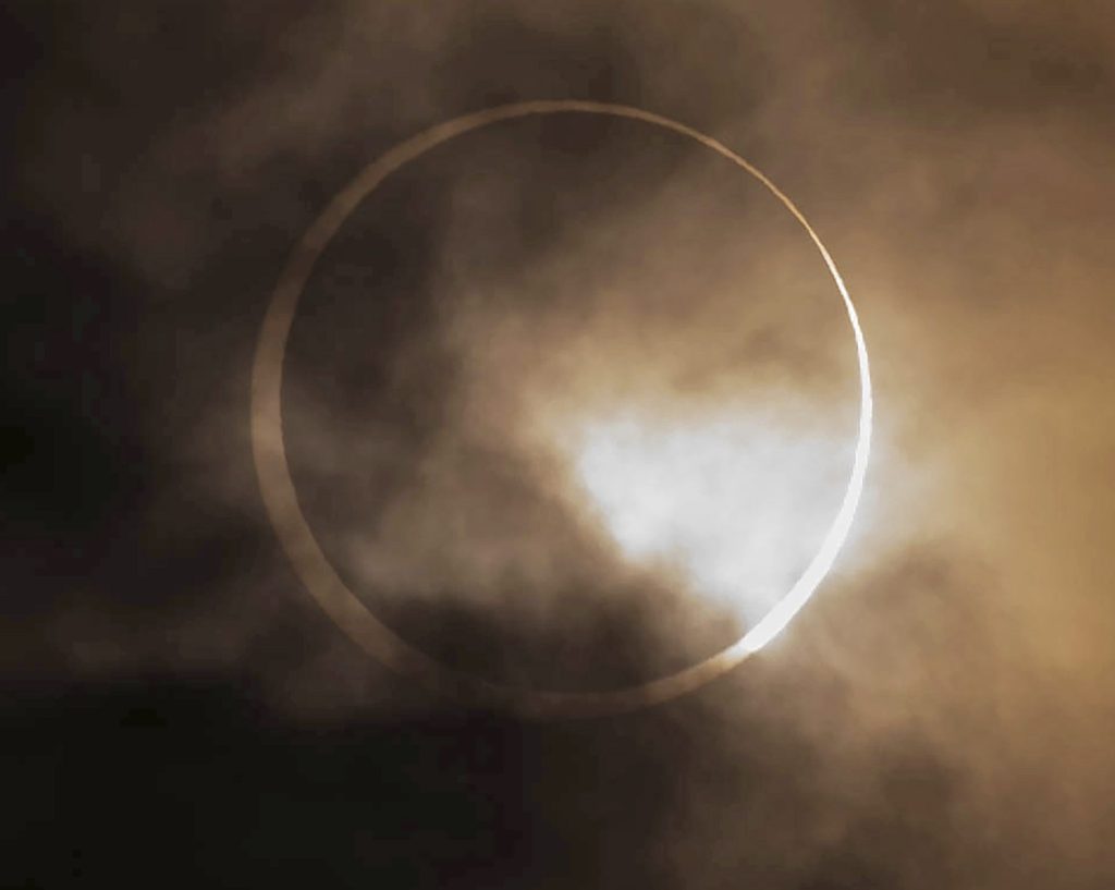 CANCÚN, México (AP) — First came the darkening skies, then the crescent-shaped shadows on the ground, and finally an eruption of cheers by crowds that gathered Saturday along the narrow path of a rare ”ring of fire” eclipse of the sun.