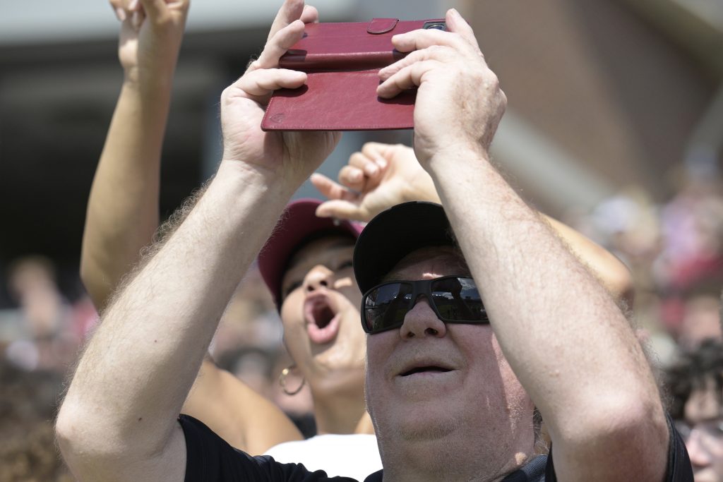 A spectator views a solar eclipse with his cell phone during the first half of an NCAA college football game between Florida State and Syracuse, Saturday, Oct. 14, 2023, in Tallahassee, Fla.