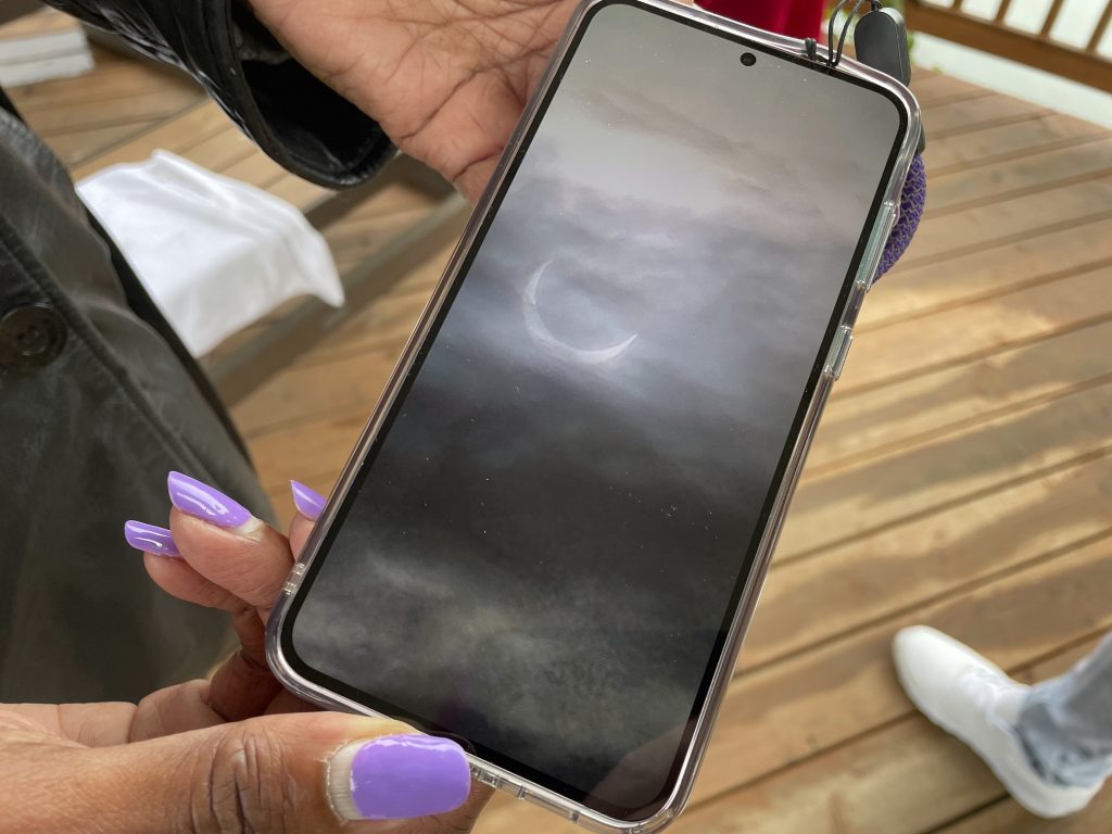 CORRECTS TO FIVE HOURS INSTEAD OF FIVE MILES - Crystal Marsh shows photos she took on her phone of the ring of fire eclipse in Eugene, Ore., Saturday, Oct. 14, 2023. Totality of the annular eclipse was at times visible with the naked eye because of the cloud cover. Marsh drove five hours from Seattle with her family in order to be in the eclipse path.