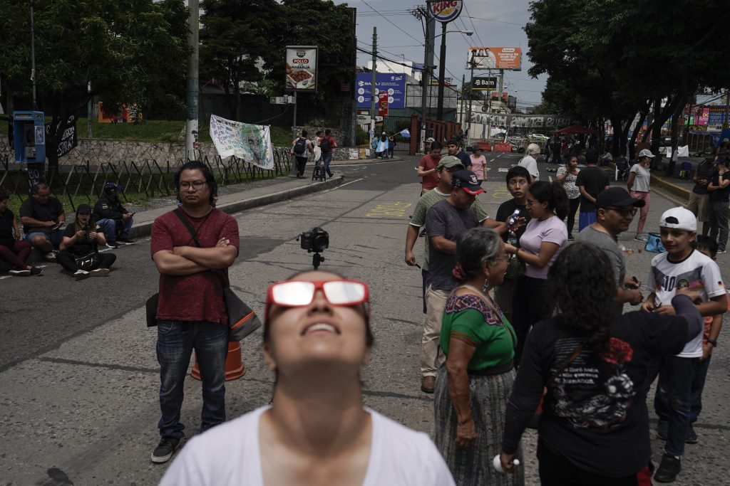 People watch the "ring of fire" solar eclipse at a blocked street by protestors in Guatemala City, Saturday, Oct. 14, 2023. The annular eclipse dimmed the skies over parts of the western U.S. and Central and South America.