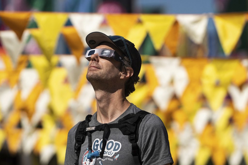 Ryan Leecock, from Dallas, looks at the eclipse through a pair of eclipse glasses on the second day of the second weekend of Austin City Limits Music Festival, Saturday, Oct. 14, 2023.