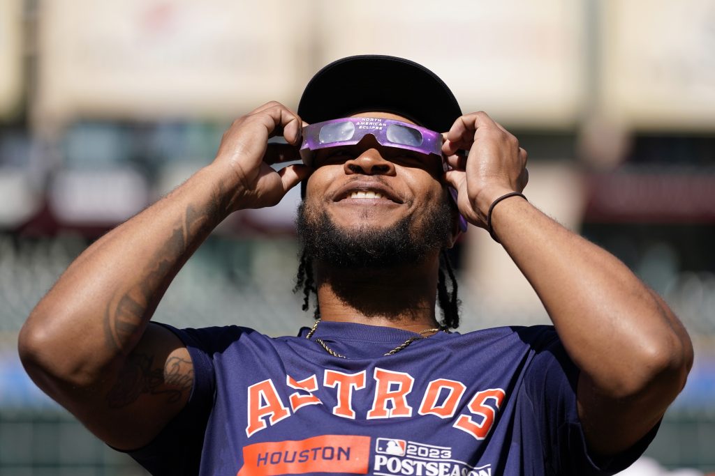 Houston Astros outfielder Corey Julks uses protective glasses to look at the solar eclipse during baseball practice in Houston, Saturday, Oct. 14, 2023. The Astros are scheduled to play the Texas Rangers in Game 1 of MLB's American League Championship Series on Sunday.