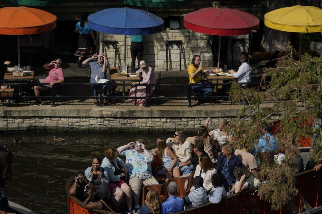 Diners along the Riverwalk and people on a river barge in San Antonio, use special glasses to keep watch as the moon moves in front of the sun during an annular solar eclipse, or ring of fire, Saturday, Oct. 14, 2023.