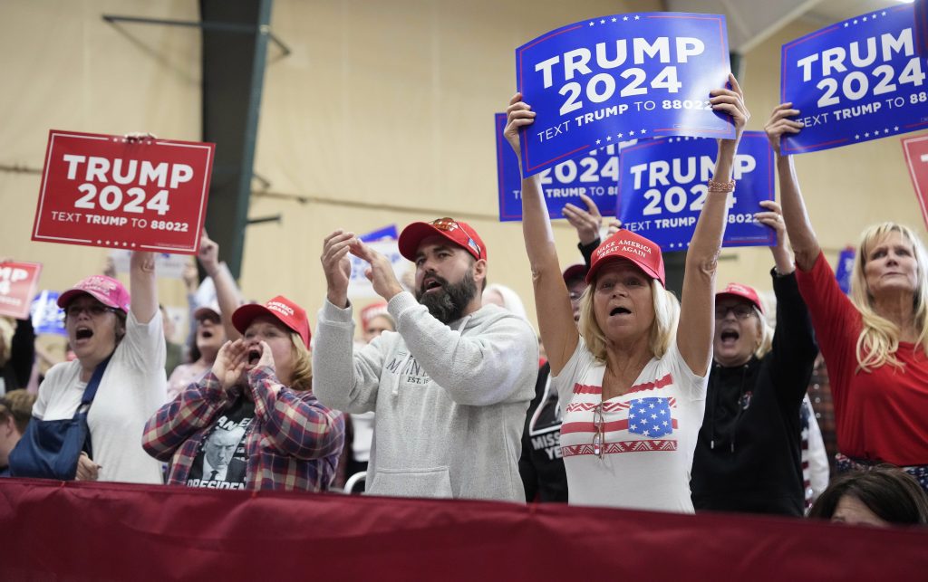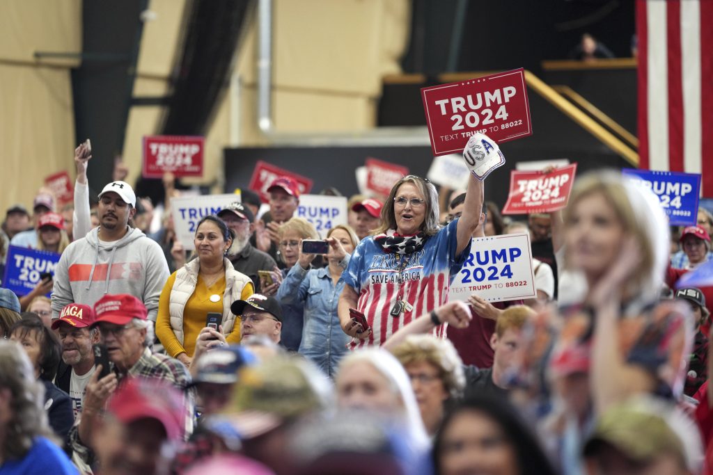 Audience members cheer for former President Donald Trump during a campaign rally Monday, Oct. 16, 2023, in Clive, Iowa.