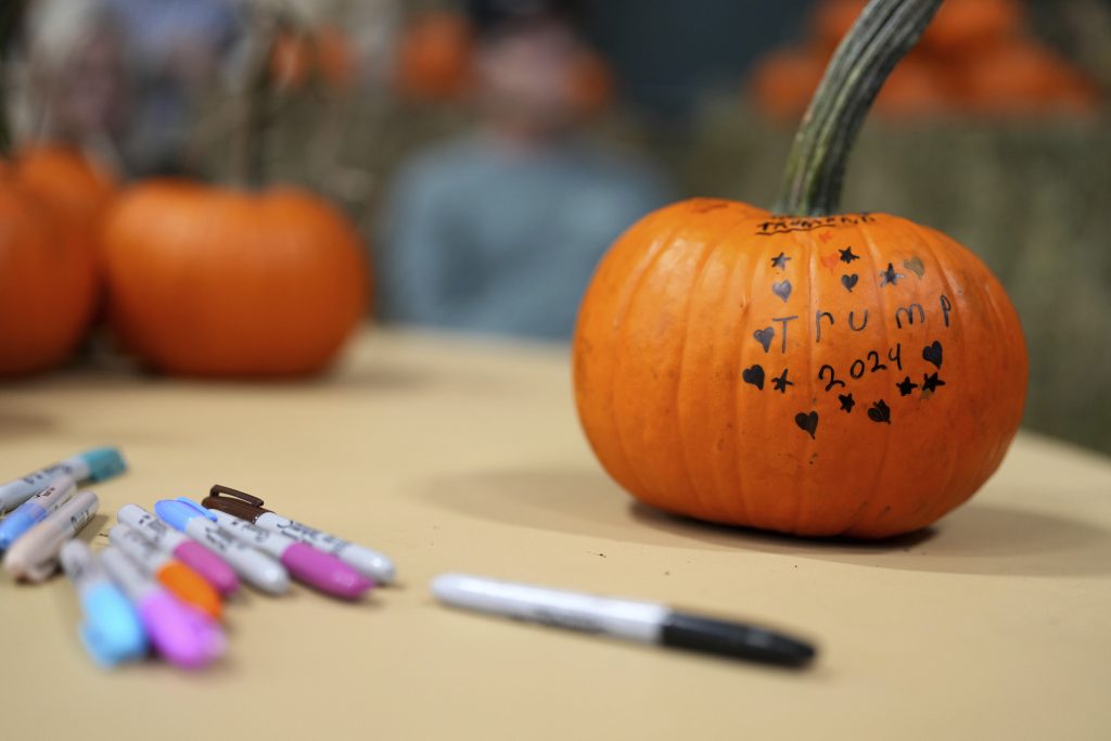 Pumpkins are decorated for former President Donald Trump during a campaign rally, Monday, Oct. 16, 2023, in Clive, Iowa.