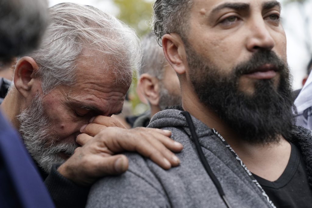 Muslim community members cry at the grave of Wadea Al Fayoume in LaGrange, Ill., Monday, Oct. 16, 2023. An Illinois landlord accused of fatally stabbing the 6-year-old Muslim boy and seriously wounding his mother was charged with a hate crime after police and relatives said he singled out the victims because of their faith and as a response to the war between Israel and Hamas.
